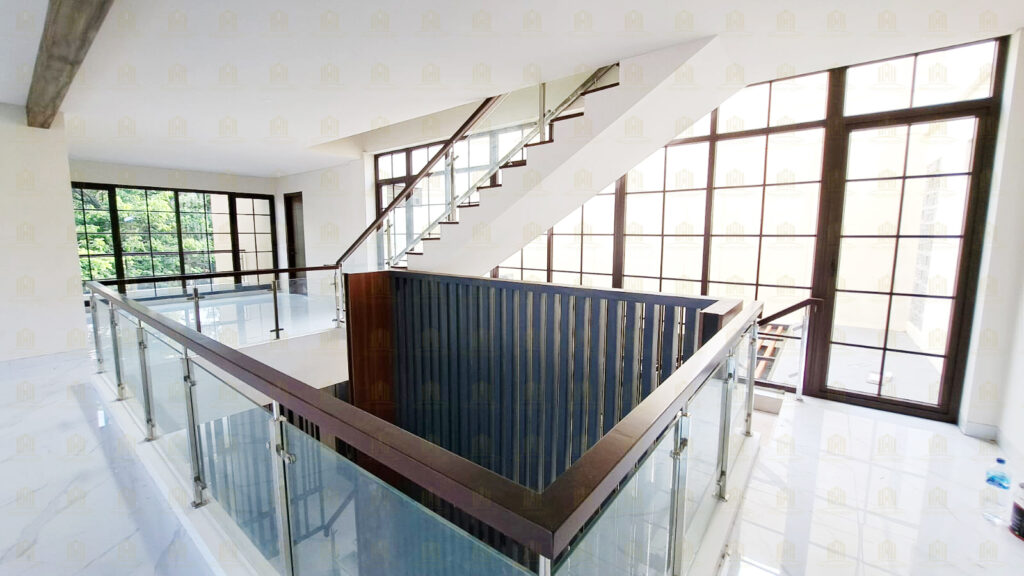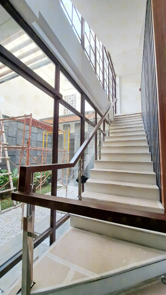 - Railing Kaca untuk Balkon dan Tangga, penggunaan railing kaca memberikan tampilan rumah yang lebih luas dan terbuka, serta menambah nilai estetika modern pada area balkon dan tangga.