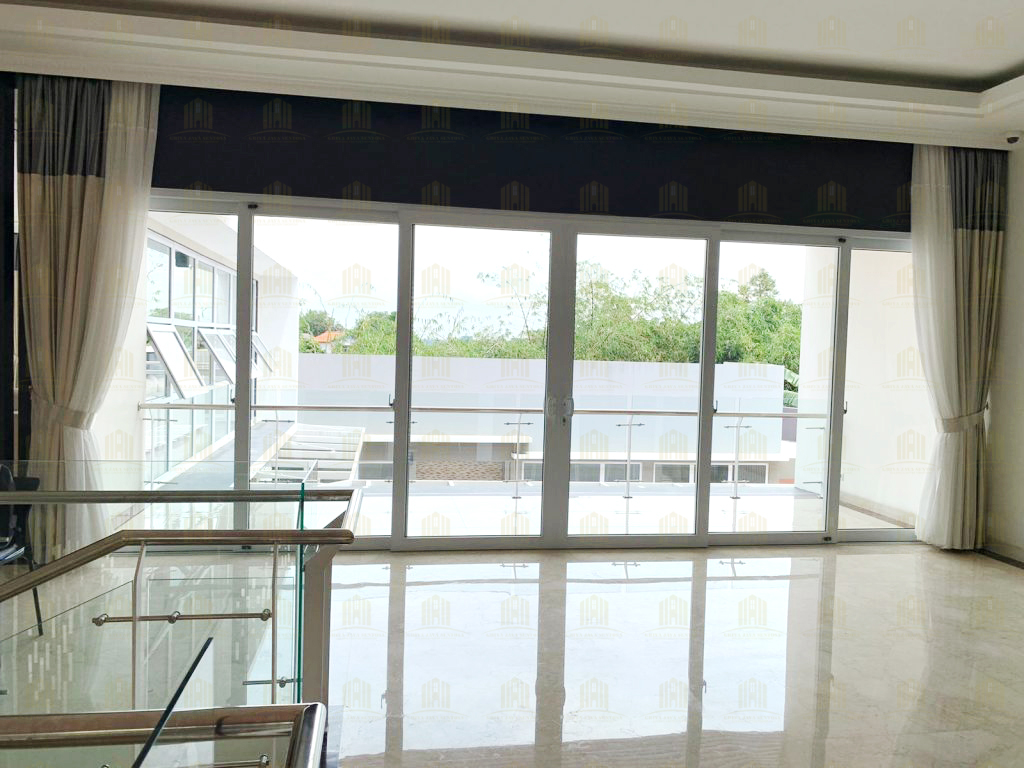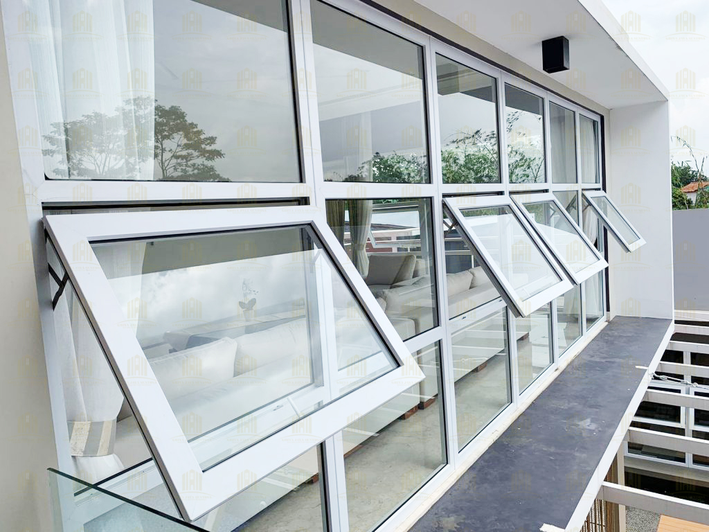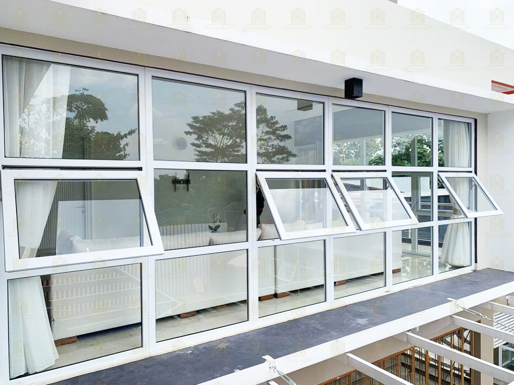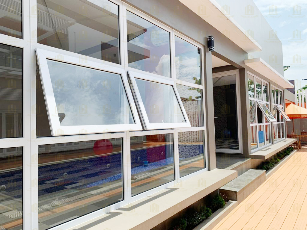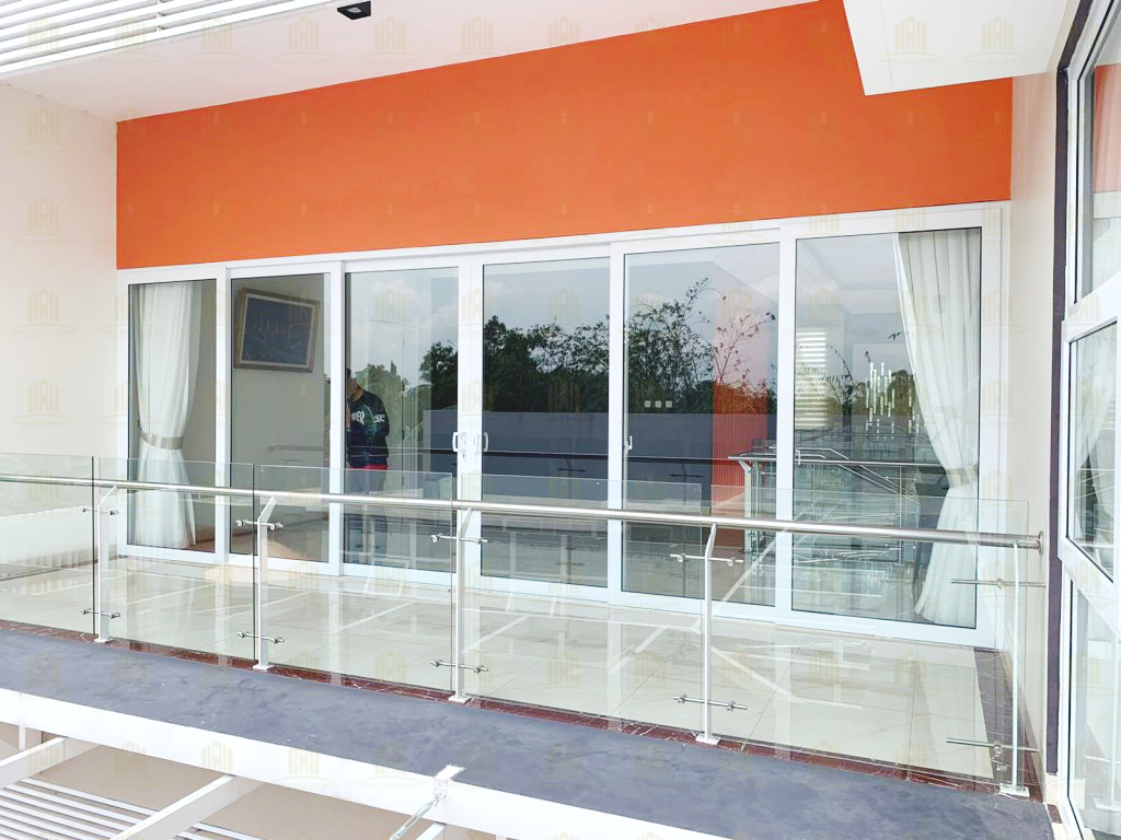 Railing kaca yang dipasang pada rumah ini memberikan kesan modern sekaligus memberikan keamanan tanpa menghalangi pandangan. Kombinasi kaca dengan struktur UPVC yang kokoh menjadikan railing ini pilihan ideal untuk area balkon dan tangga. - Jendela Jungkit dengan Tambahan Kacamati Menghadap Kolam Renang